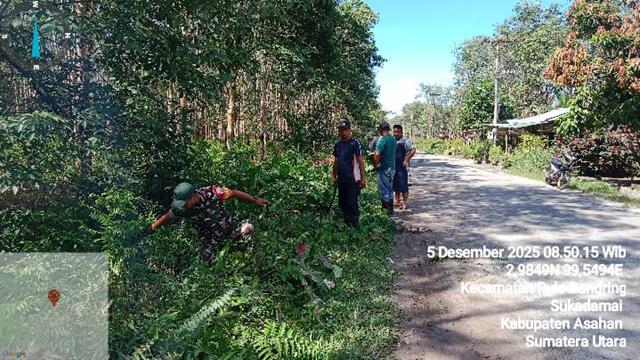 Asahan  |  Babinsa adalah ujung tombaknya satuan di lapangan, maka kegiatan Komsos yang dilaksanakan oleh Babinsa dapat diterima positif oleh masyarakat, dalam rangka agar terjalinnya tali silaturahmi antara Babinsa dan masyarakat binaan, bersama masyarakat melaksanakan karya bhakti dengan gotong royong membersihkan kiri kanan jalan perkampungan warga, dalam kesempatan ini seperti yang dilakukan oleh Personel Bintara Pembina Desa (Babinsa) Koramil 18/Meranti jajaran Kodim 0208/Asahan Serma Jalil turun kewilayah binaan untuk melaksanak gotong royong bersama dengan masyarakat, pembersihan kiri kanan Jalan bersama masyarakat melaksanakan gotong royong, kegiatan kerja bakti ini merupakan upaya bersama dalam mewujudkan kepedulian terhadap kebersihan lingkungan.Kondisi parit dan bahu jalan yang ada semakin menyempit karena ditumbuhi rumput dan semak yang menjalar ke bahu jalan sehingga sangat kotor, bersama dengan Sekdes Suka Damai (Bapak M Fitrah), Para Kadus Desa Suka Damai dan Warga Desa Suka Damai, kegiatan tersebut yang dilaksanakan bertempat di Dusun VIII Jalan Protokol Desa Suka Damai Kecamatan Pulo Bandring Kabupaten Asahan, Jumat (05/12/2025).