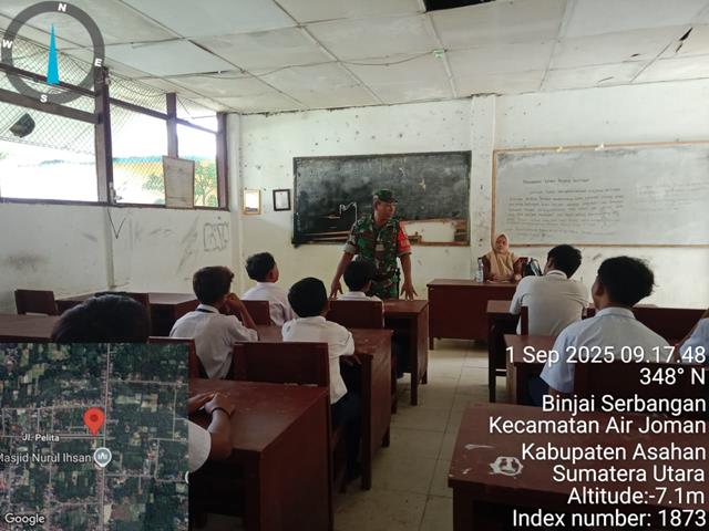 Asahan | Guna penyiapan siswa siswa mengetahui Wawasan kebangsaan tetang memupuk rasa cinta tanah air menjalankan kedisplinan disekolah dan menjauhi segala bentuk Narkoba sejak dini serta menanamkan Cinta Tanah Air. Untuk menumbuhkan jiwa patriotisme terhadap generasi muda penerus bangsa, dalam kesempatan ini seperti yang dilakukan oleh Personel Bintara Pembina Desa (Babinsa) Koramil 07/Air Joman jajaran Kodim 0208/Asahan Serma Syadan turun kewilayah binaan untuk melaksanakan kegiatan memberikan materi Wawasan Kebangsaan (Wasbang) kepada Siswa-siswi SMP, dengan melaksanakan pembinaan karakter sikap dan kedisiplinan kepada Siswa/Siswi di SMP Swasta Daerah Air Joman, bersama dengan Ibu Azzahra (Guru) dan para Siswa/Siswi SMP Swasta Daerah, kegiatan tersebut yang dilaksanakan bertempat di Lingkungan VI Kelurahan Binjai Serbangan Kecamatan Air Joman Kabupaten Asahan, Senin (01/09/2025).