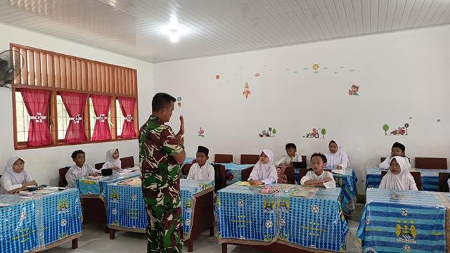 Asahan | Dalam rangka untuk menumbuhkan jiwa patriotisme terhadap generasi muda penerus bangsa, dalam kesempatan ini seperti yang dilakukan oleh Personel Bintara Pembina Desa (Babinsa) Koramil 13/Buntu Pane jajaran Kodim 0208/Asahan Serda Triandi turun kewilayah binaan untuk melaksanakan kegiatan Bintahwil kepada Siswa-siswi SD Negeri 010106, dengan melaksanakan kegiatan Wawasan Kebangsaan di Sekolah SD 010106 Kelas V Desa Sei Silau Barat yang bertujuan untuk mengenalkan isi dari Pancasila sebagai Dasar Negara kepada generasi Penerus Bangsa serta meningkatkan Hubungan harmonis antara Babinsa dan Pengurus Sekolah SD di wilayah Binaan, bersama dengan Kepala Sekolah (Bapak Darwin SPd), Guru Kelas V (Julina Spd) dan 20 Orang Siswa/Siswi, kegiatan tersebut yang dilaksanakan bertempat di SD 010106 Desa Sei Silau Barat Kecamatan Setia Janji Kabupaten Asahan, Rabu (06/08/2025).