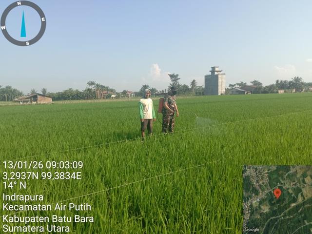 Dalam kesempatan ini seperti yang dilakukan oleh Personel Bintara Pembina Desa (Babinsa) Koramil 02/Air Putih jajaran Kodim 0208/Asahan Sertu Fahmi turun kewilayah binaan untuk turut serta melaksanakan pendampingan Hanpangan jenis tanaman padi, kegiatan Hanpangan membantu menyemprot hama jenis ulat guna untuk pertumbuhan padi agar tumbuh lebih baik, kegiatan Hanpangan membantu Petani menyemprot hama ulat daun padi, dengan melaksanakan kegiatan Hanpangan membantu Bapak Purba menyemprot hama padi seluas 3 Rante, kegiatan tersebut yang dilaksanakan bertempat di Dusun 2 Desa Tanjung Kubah Kecamatan Air Putih Kabupaten Batu Bara, Selasa (13/01/2026).