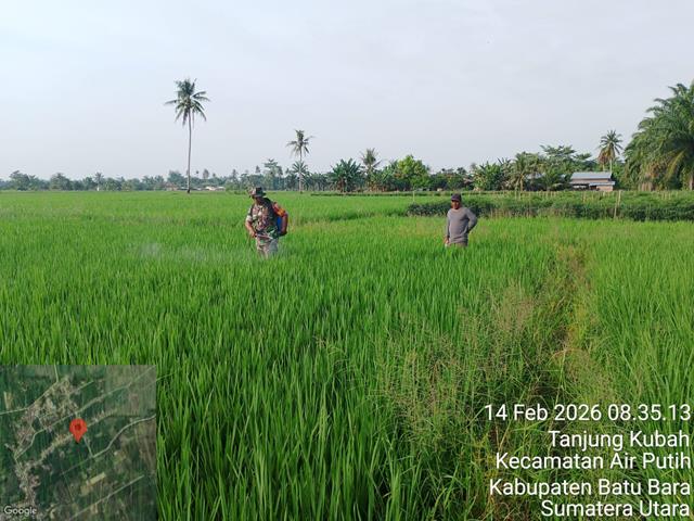 Dalam kesempatan ini seperti yang dilakukan oleh Personel Bintara Pembina Desa (Babinsa) Koramil 02/Air Putih jajaran Kodim 0208/Asahan Serka Ady Sutrisno turun kewilayah binaan untuk turut serta melaksanakan pendampingan Hanpangan jenis tanaman padi, pendampingan kepada petani adapun maksud dan tujuan membantu petani menyemprot hama pada padi agar padi tumbuh dengan baik dan mendapat hasil yang bagus supaya dapat mendukung ketahanan pangan Nasional serta memberi semangat dan memberi motivasi kepada petani agar lebih maju dan mendapatkan hasil yang bagus, kegiatan Hanpangan membantu menyemprot racun hama walang sanget agar tidak mengganggu pertumbuhan tanaman padi disawah dan menghasilkan hasil yang maksimal di sawah pak Erwin Seluas 7 Rante, bersama dengan Pak Lasimin, kegiatan tersebut yang dilaksanakan bertempat di Desa Tanjung Mulya Kecamatan Air Putih Kabupaten Batu Bara, Sabtu (14/02/2026).
