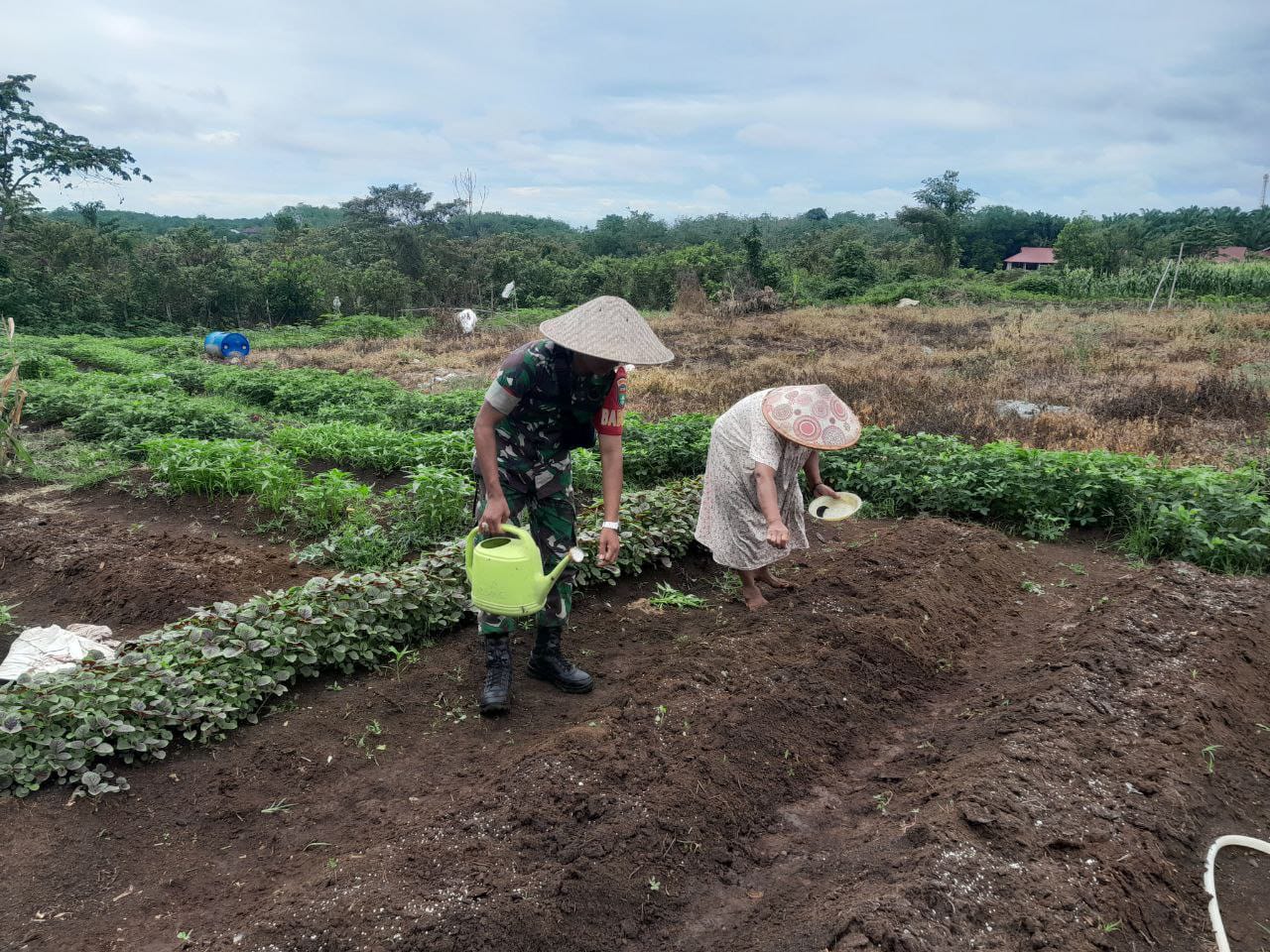 Semangat Babinsa Koramil 02/KT Kodim 0302/Inhu Pratu Bastanul Fauzi ikut terjun ke kebun membantu petani penyemaian bayam yg berada Di Desa Pulau Tongah Kec. Benai Kab. Kuansing. Selasa (07/04/2026).