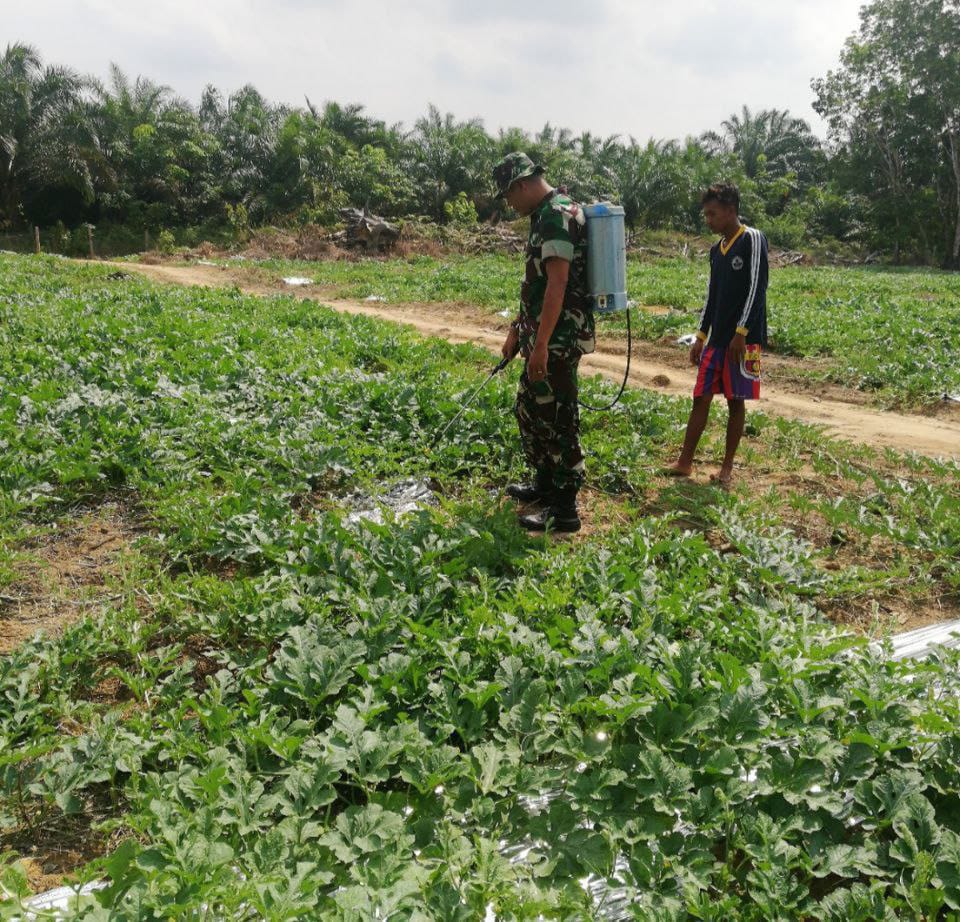 Dalam upaya menciptakan swasembada dan ketahanan pangan di desa Marsawah Babinsa Koramil 02/Kuantan Tengah Serda Marizal,As bersama dengan masyarakat desa binaan melaksanakan kegiatan Penyemprotan pada tanaman semangka di wilayah pertanian di desa binaan.