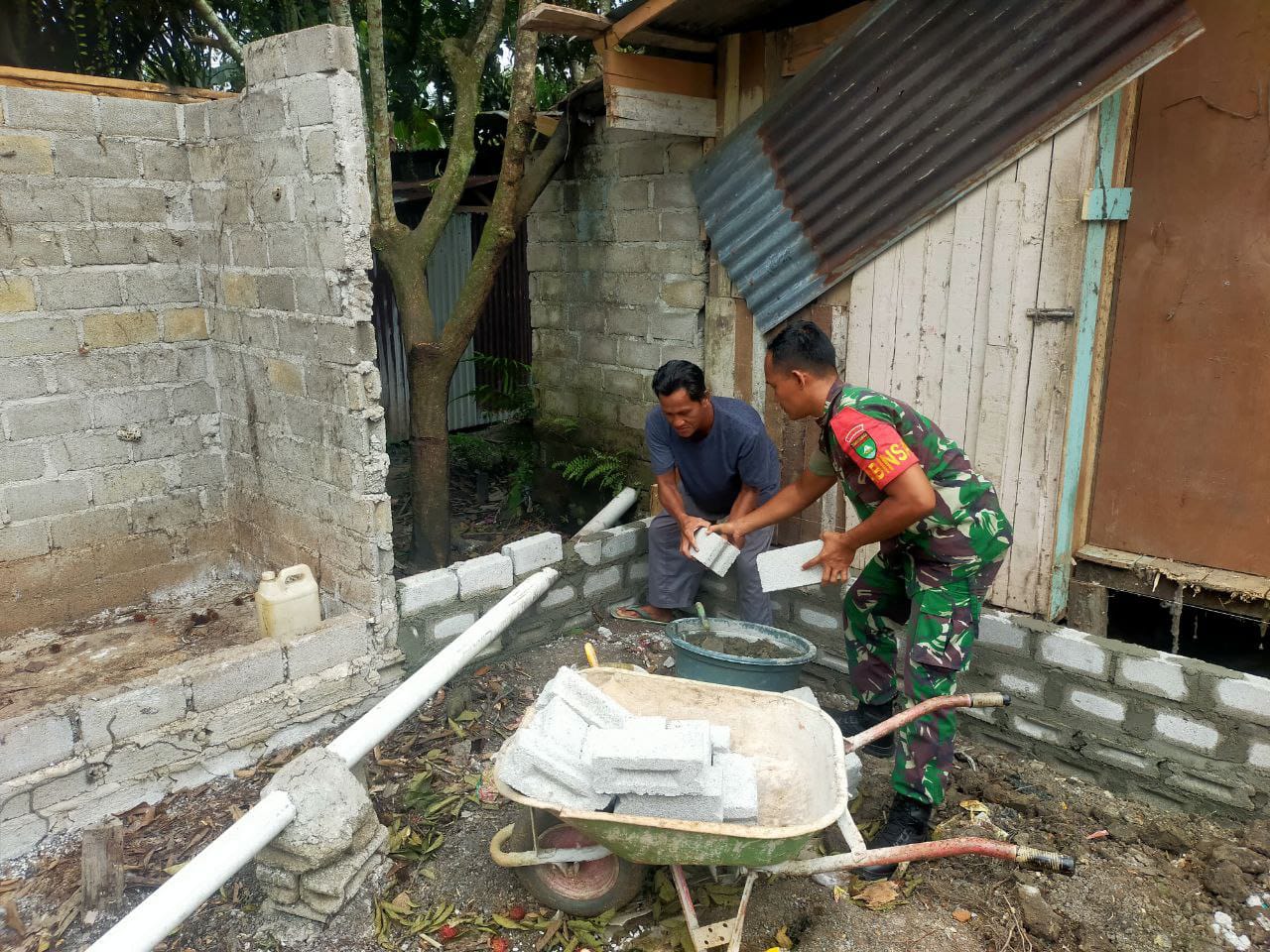 Teluk Kuantan – Babinsa Koramil 02/KT Kodim 0302/Inhu Koptu Indra Eka Putra Membantu pembuatan rumah warga Kel. Sungai Jering Kec. Kuantan Tengah Kab. Kuansing, Kamis (27/11/2025).