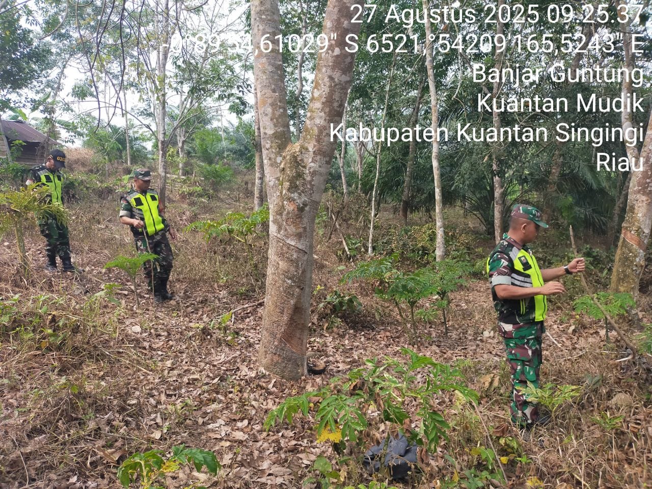 Babinsa Koramil 08/KM Kodim 0302/Inhu Sertu Hendro dan Tiga rekan Babinsa Lainnya melaksanakan Kegiatan Patroli Kebakaran Hutan Dan Lahan ( Karhutla ) Di wilayah Desa Banjar Guntung Kecamatan Kuantan mudik Kabupaten Kuantan Singingi. Rabu ( 27/08/2025 ).