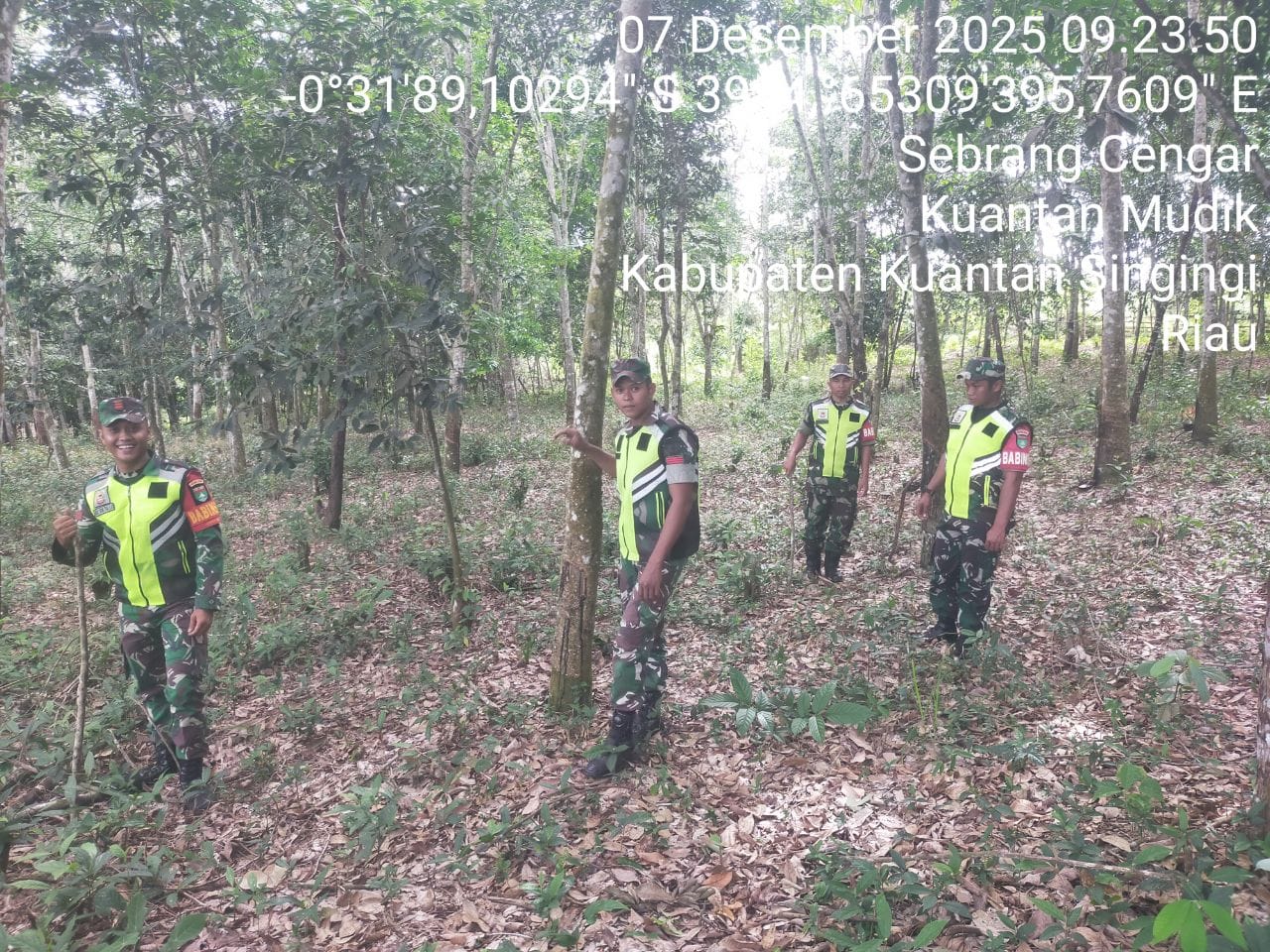 Babinsa Koramil 08/KM Kodim 0302/Inhu Sertu Nopin dan Tiga rekan Babinsa Lainnya melaksanakan Kegiatan Patroli Kebakaran Hutan Dan Lahan ( Karhutla ) Di wilayah Desa Sebrang Cengar Kecamatan Kuantan mudik Kabupaten Kuantan Singingi. Minggu ( 07/12/2025 ).