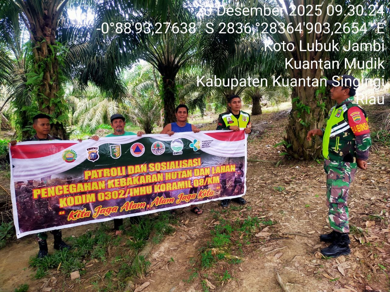 Babinsa Koramil 08/KM Kodim 0302/Inhu Sertu Adi Priyanto dan rekan Babinsa Lainnya melaksanakan Kegiatan Patroli Kebakaran Hutan Dan Lahan ( Karhutla ) Di wilayah Desa Koto Lubuk Jambi Kecamatan Kuantan mudik Kabupaten Kuantan Singingi. Selasa ( 23/12/2025 ).