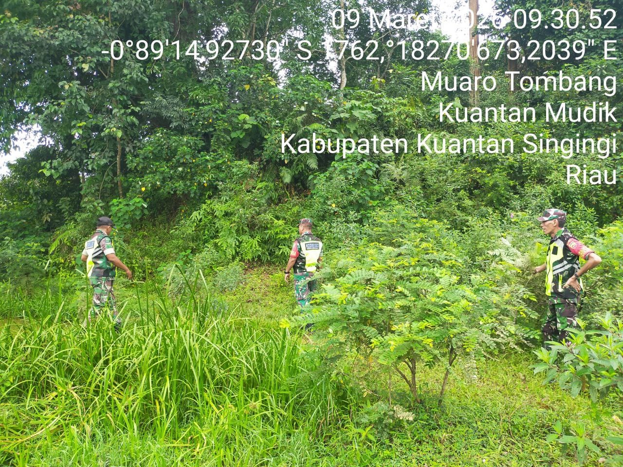 Babinsa Koramil 08/KM Kodim 0302/Inhu Sertu Hendro dan rekan Babinsa Lainnya melaksanakan Kegiatan Patroli Kebakaran Hutan Dan Lahan ( Karhutla ) Di wilayah Desa Muaro Tombang Kecamatan Kuantan mudik Kabupaten Kuantan Singingi. Senin (09/03/2026 ).