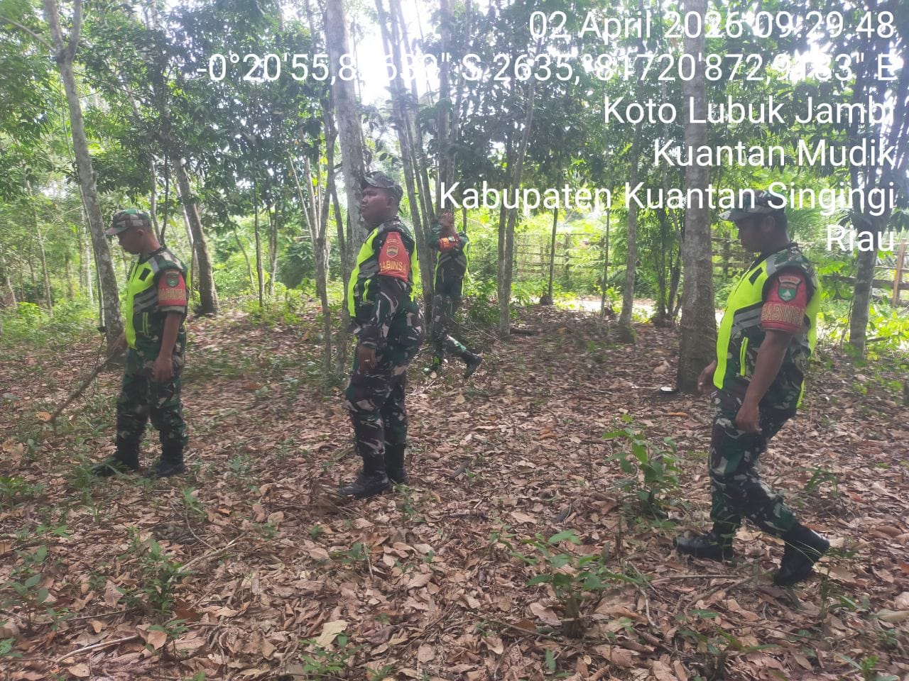 Babinsa Koramil 08/KM Kodim 0302/Inhu Sertu Hendro dan rekan Babinsa Lainnya melaksanakan Kegiatan Patroli Kebakaran Hutan Dan Lahan ( Karhutla ) Di wilayah Desa Koto Lubuk Jambi Kecamatan Kuantan mudik Kabupaten Kuantan Singingi. Kamis (02/04/2026 ).