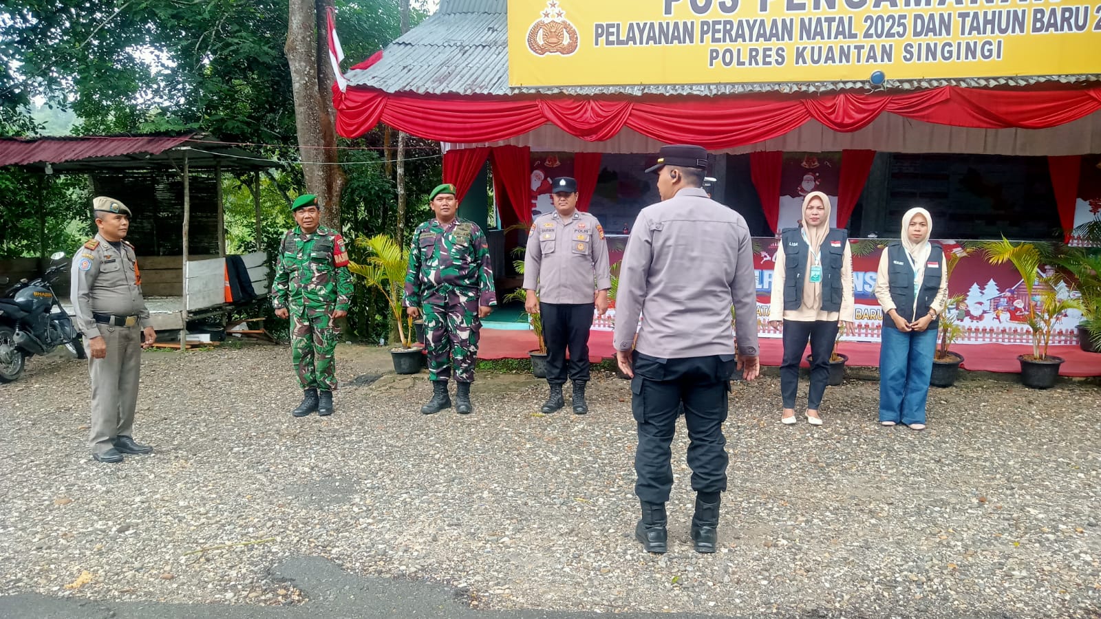 Babinsa Koramil 08/KM Kodim 0302/Inhu Sertu Hendro Dan Kopda Alex Simanjuntak melaksanakan Kegiatan Pam Nataru bersama anggota Polres Kuansing,Satpol pp,Dishub,dan Puskesmas,bertempat di Pos Pam Perbatasan Riau-Sumbar,Desa Kasang Kecamatan Kuantan Mudik Kabupaten kuantan Singingi guna memberikan rasa aman kepada warga pada libur Natal dan Tahun baru 2026. Minggu ( 28/12/2025 ).