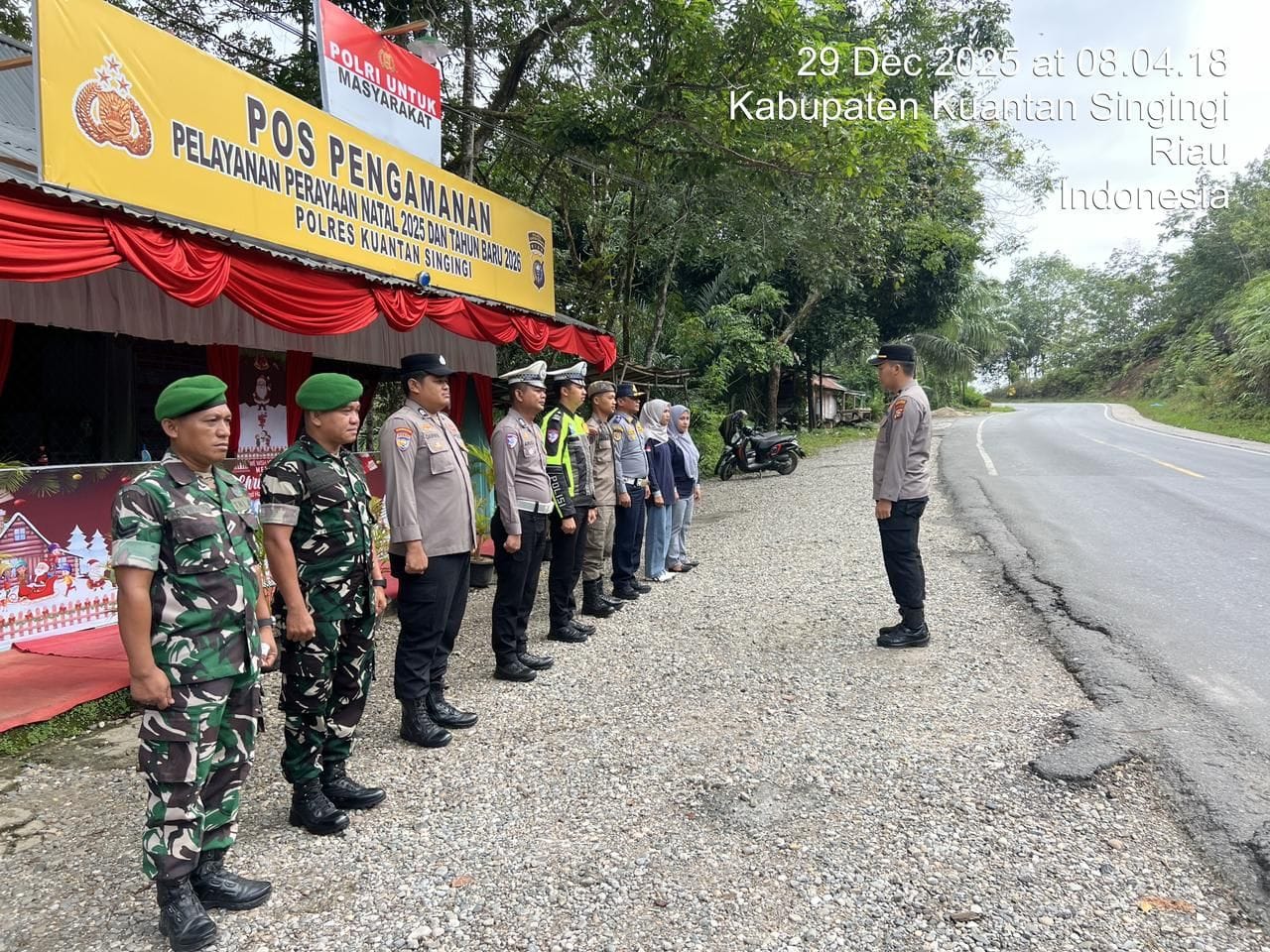 Babinsa Koramil 08/KM Kodim 0302/Inhu Sertu Hendi Dan Sertu Adi Priyanto melaksanakan Kegiatan Pam Nataru bersama anggota Polres Kuansing,Satpol pp,Dishub,dan Puskesmas,bertempat di Pos Pam Perbatasan Riau-Sumbar,Desa Kasang Kecamatan Kuantan Mudik Kabupaten kuantan Singingi guna memberikan rasa aman kepada warga pada libur Natal dan Tahun baru 2026. Senin ( 29/12/2025 ).