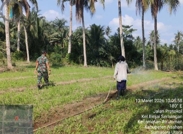 Asahan | Sebagai bentuk dukungan terhadap sektor pertanian dan ketahanan pangan di wilayah binaan, Babinsa melaksanakan kegiatan membantu petani menyiram tanaman sayur kangkung di lahan pertanian milik warga. Kegiatan tersebut dilakukan bersama para petani guna memastikan tanaman kangkung mendapatkan asupan air yang cukup sehingga dapat tumbuh dengan baik dan menghasilkan panen yang maksimal. Kehadiran Babinsa di tengah aktivitas pertanian ini juga menjadi bentuk kepedulian serta dukungan moril bagi para petani. Babinsa menyampaikan bahwa pendampingan kepada petani merupakan bagian dari tugas pembinaan teritorial sekaligus wujud kemanunggalan TNI dengan rakyat. Ia juga memberikan motivasi kepada para petani agar terus semangat dalam mengelola lahan pertanian sebagai sumber penghasilan keluarga.