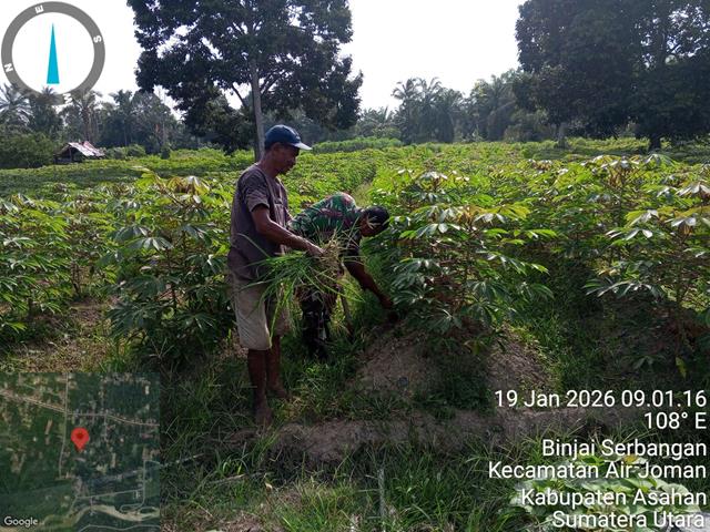 Asahan  |  Dalam rangka untuk meningkatkan taraf perekonomian masyarakat dengan memanfaatkan keberadaan lahan tidur, setiap orang tentu sudah tak asing lagi dengan makanan ubi kayu, tetapi ubi kayu tersebut lebih terkenal dengan nama singkong, dalam kesempatan ini seperti yang dilakukan oleh Personel Bintara Pembina Desa (Babinsa) Koramil 07/Air Joman jajaran Kodim 0208/Asahan Sertu Wagito turun kewilayah binaan untuk melaksanakan pendampingan hanpangan di lahan ubi warga binaan, pendampingan Hanpangan di lahan singkong/ubi, kegiatan Wanwil/Hanpangan kebun singkong, dengan melaksanakan Hanpangan di ladang Bapak Supri seluas 6 Rante, bersama dengan Bapak Supri (Petani) dan Bapak Rusli, kegiatan tersebut yang dilaksanakan bertempat di Lingkungan Xl Kelurahan Binjai Serbangan Kecamatan Air Joman Kabupaten Asahan, Senin (19/01/2026).