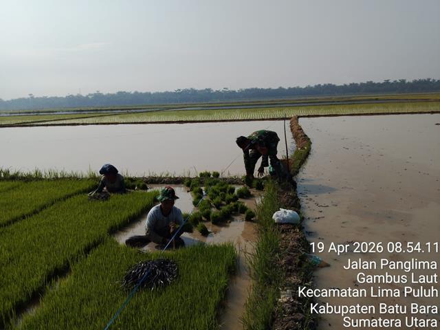 Batu Bara  |  Dalam upaya mendukung program Swasembada Pangan sesuai perintah Dandim 0208/Asahan tentang pemanfaatan kekayaan alam, dalam kesempatan ini seperti yang dilakukan oleh Personel Bintara Pembina Desa (Babinsa) Koramil 02/Air Putih jajaran Kodim 0208/Asahan Serda Indra turun kewilayah binaan untuk melaksanakan kegiatan bersama warga untuk melaksanakan kegiatan mencabut bibit padi, dengan sekaligus melaksanakan pemantauan kegiatan Ketahanan pangan dan membantu petani menanam padi, kegiatan Ketahanan Pangan membantu mencabut bibit padi bersama pekerja dan pemilik lahan dilahan sawah milik Bapak A Sirait, kegiatan ini adalah program bakti TNI AD kepada masyarakat agar terjalin silaturahmi yang baik kepada warga, dengan terus melakukan pendampingan terhadap para Petani dengan turun langsung ke sawah desa binaannya melaksanakan kegiatan mencabut bibit padi yang sudah siap tanam, bersama dengan Ibu B Sitorus (Pekerja Lahan) dan Ibu H Sirait (Pekerja Lahan), kegiatan tersebut yang dilaksanakan bertempat di Desa Sukaramai Kecamatan Air Putih Kabupaten Batu Bara, Minggu (19/04/2026).