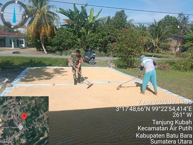 Batu Bara | Selain membantu secara langsung, para Babinsa juga memberikan edukasi kepada para petani untuk meningkatkan produktivitas dan kualitas hasil panen mereka, kami berharap pendampingan seperti ini dapat memberikan dampak positif kepada petani dalam menjaga kualitas panen mereka, dalam kesempatan ini seperti yang dilakukan oleh Personel Bintara Pembina Desa (Babinsa) Koramil 02/Air Putih jajaran Kodim 0208/Asahan Kopda Septiadi Wijatnarko turun kewilayah binaan untuk menunjukkan dedikasinya dalam mendukung masyarakat desa binaannya dan melaksanakan kegiatan ketahanan pangan membantu menjemur gabah padi yang masih basah agar cepat kering, kegiatan Hanpangan membantu menjemur gabah padi yg baru dipanen agar cepat mengering milik Bapak Tugiman sebanyak 4 goni, kegiatan tersebut yang dilaksanakan bertempat di Desa Tanjung Kubah Kecamatan Air Putih Kabupaten Batu Bara, Selasa (07/04/2026).