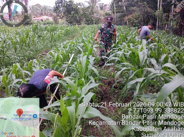 Wujud nyata kemanunggalan TNI dengan rakyat dalam meningkatkan ketahanan pangan wilayah, dalam kesempatan ini Personel Bintara Pembina Desa (Babinsa) Koramil 14/Bandar Pasir Mandoge jajaran Kodim 0208/Asahan Serka L Siringo Ringo turun kewilayah desa binaan untuk melaksanakan kegiatan Komunikasi Sosial (Komsos) bersama dengan warga masyarakat sekaligus memberikan Motivasi kepada petani jagung sehingga dapat meningkatkan kesejahteraan para petani jagung, bersama masyarakat melaksanakan pendampingan Ketahanan Pangan (Hanpang) jenis tanaman Jagung Pioneer Babinsa hadir untuk membantu pembersihan lahan jagung supaya hasilnya lebih baik dan menghasilkan buah yang banyak sesuai yang diharapkan oleh petani, kegiatan ini bertujuan membantu warga dan TNI semakin di cintai Rakyat, bersama dengan Bapak Fikri Lubis dan Ibu Nurmala, kegiatan tersebut yang dilaksanakan bertempat di Dusun III Desa Bandar Mandoge Kecamatan Bandar Pasir Mandoge Kabupaten Asahan, Sabtu (21/02/2026).