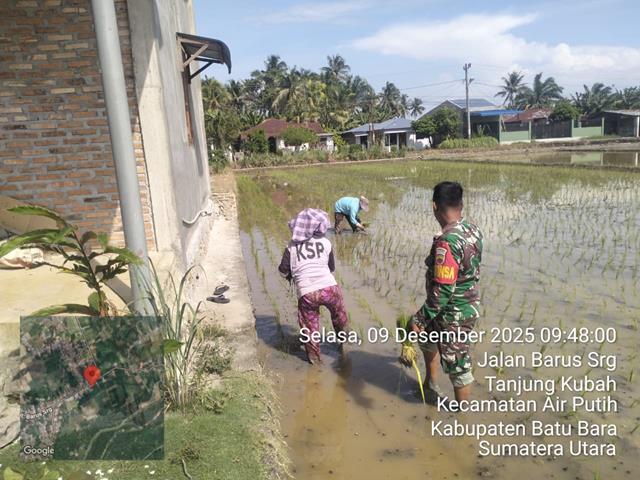 Dalam kesempatan ini seperti yang dilakukan oleh Personel Bintara Pembina Desa (Babinsa) Koramil 02/Air Putih jajaran Kodim 0208/Asahan Kopda Muhammad Hamka turun kewilayah binaan untuk turut serta melaksanakan kegiatan pendampingan Hanpangan, dengan melaksanakan Pendampingan kepada petani menanam padi agar tercipta suwasembada pangan, kegiatan Ketahanan Pangan membantu petani menanam bibet padi di sawah, kegiatan yang dilaksanakan di sawah milik Bapak Citra, kegiatan tersebut yang dilaksanakan berlokasi di Desa Tanjung Mulia Kecamatan Air Putih Kabupaten Batu Bara, Selasa (09/12/2025).