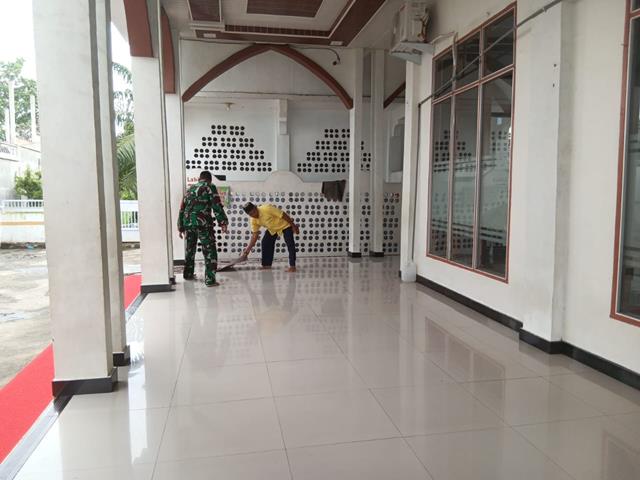 Bantu Petugas Mesjid Bersihkan Sarana Rumah Ibadah Dilakukan Personel Koramil 04/Talawi Kodim 0208/Asahan Diwilayah Binaan