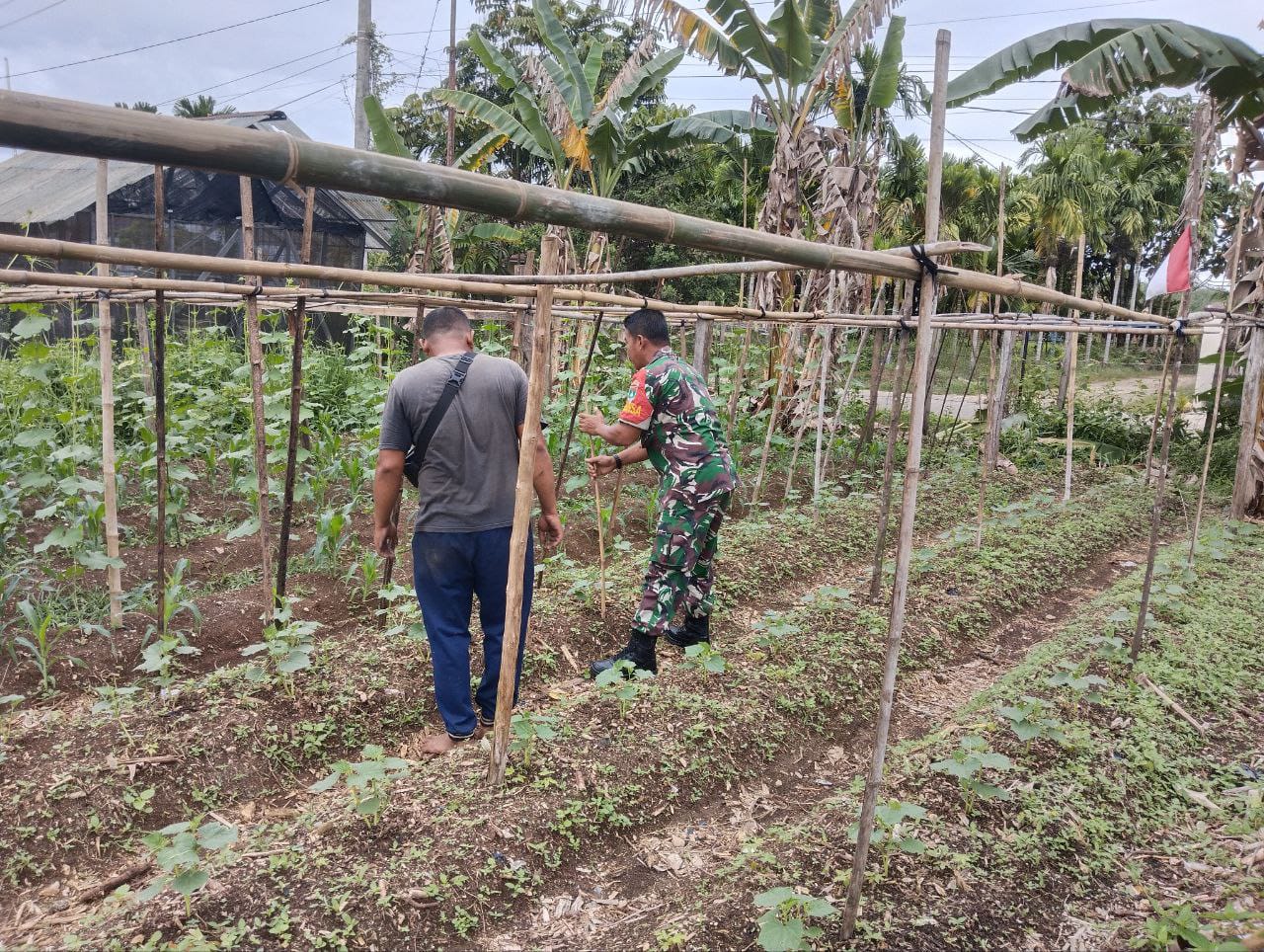 Teluk Kuantan – Babinsa Koramil 02/KT Kodim 0302/Inhu Serma Teni Maldes melaksanakan kegiatan membantu petani merawat tanaman kacang panjang, di Desa Geringging Jaya Kec. Sentajo Raya Kab. Kuansing, Selasa (13/01/2026).