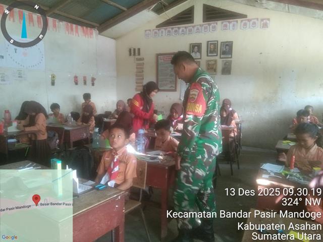 Asahan | Dalam rangka untuk membangun semangat juang generasi muda yang berwawasan pancasila untuk menyongsong masa depan yang berkualitas di era digital, dalam kesempatan ini seperti yang dilakukan oleh Personel Bintara Pembina Desa (Babinsa) Koramil 14/Bandar Pasir Mandoge jajaran Kodim 0208/Asahan Sertu Supriadi turun kewilayah binaan untuk melaksanakan kegiatan Wasbang, kegiatan Wanwil yakni memberikan wawasan kebangsaan kepada anak sekolah, dengan memberikan wawasan Kebangsaan kepada siswa-siswi, dengan melaksanakan Wasbang di Sekolah SD.13 Dusun (V) desa Badar Pasir Mandoge, kegiatan tersebut memberi Pelajaran kepada anak murid tentang Eskra kurikuler keterampilan menggambar sekaligus kegiatan ini menunjang tugas pokok TNI agar semakin dicintai Rakyat, bersama dengan Ibu Erna Wati dan para Siswa/I, kegiatan tersebut yang dilaksanakan bertempat di Jalan Besar Dusun (V) Desa Mandige Kecamatan Bandar Pasir Mandoge Kabupaten Asahan, Sabtu (13/12/2025).