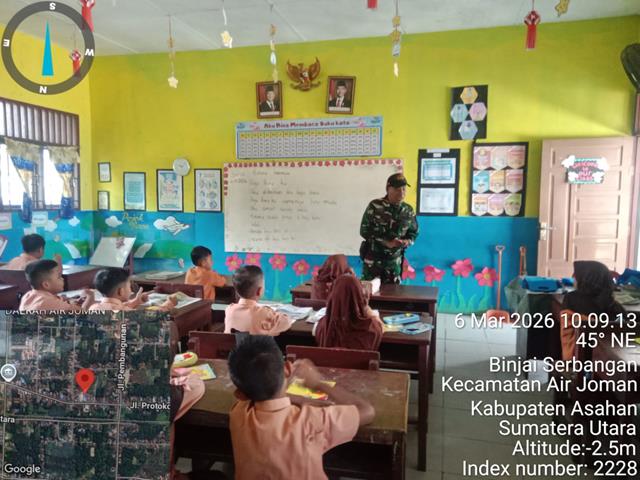 Asahan | Untuk menumbuhkan jiwa patriotisme terhadap generasi muda penerus bangsa, dalam kesempatan ini seperti yang dilakukan oleh Personel Bintara Pembina Desa (Babinsa) Koramil 07/Air Joman jajaran Kodim 0208/Asahan Serma Syahdan turun kewilayah binaan untuk melaksanakan kegiatan Bintahwil kepada Siswa-siswi SD, dengan melaksanakan Wawasan Kebangsaan, dalam kegiatan ini Babinsa Serma Syahdan mengajak para siswa/i utk giat dlm menuntut ilmu rajin belajar menjaga ketertiban di lingkungan sekolah serta pemberian materi wawasan tentang Cinta Tanah Air, dalam kegiatan Wasbang ini bertujuan untuk membentuk karakter para siswa-siswi dengan memupuk jiwa Nasionalisme sekaligus untuk membina kedisiplinan dan mematuhi peraturan sekolah, bersama dengan Ibu Sulistiawaty S.pd (Guru), kegiatan tersebut yang dilaksanakan bertempat di UPTD SDN 015905 Binje Serbangan Lingkungan V Kelurahan Binje Serbangan Kecamatan Air Joman Kabupaten Asahan, Jumat (06/02/2026).