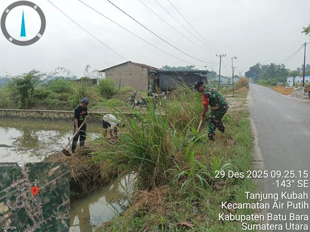 Batu Bara  |  Gotong-royong ataupun kerja bakti ini merupakan sarana kebersamaan antar warga guna membantu tercapainya Kenyamanan Desa, dengan melakukan Pembangunan atau Pembersihan yang bermanfaat bagi kepentingan seluruh warga, dalam kesempatan ini seperti yang dilakukan oleh Personel Bintara Pembina Desa (Babinsa) Koramil 02/Air Putih jajaran Kodim 0208/Asahan Sertu Sumardi turun kewilayah binaan untuk melaksanakan kegiatan Gotong-royong, kegiatan bersama masyarakat melaksanakan gotong royong membersihkan saluran irigasi adapun topik pembicaraan tentang  program panen setahun dua kali agar terlaksana dengan baik dan lancer, kegiatan gotong royong besama warga membersihkan aliran irigasi dan membersihkan rumput di pinggiran irigasi agar kelihatan bersih, skegiatan gotong royong bersama kelompok tani membersihkan saluran air, bersama dengan Bapak Wahyudi (Ketua Pok Tani) dan warga, kegiatan tersebut yang dilaksanakan berlokasi di Dusun Melati Desa Tanjung Kubah Kecamatan Air Putih Kabupaten Batu Bara, Senin (29/12/2025).