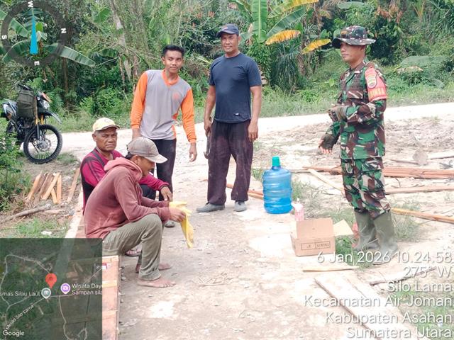 Asahan | Dalam setiap ada kegiatan para Babinsa berpesan agar berhati-hati dalam bekerja, berkomunikasi dengan warga rajin dilakukan oleh para personel Babinsa diwilayah binaan, dalam kesempatan tersebut seperti yang dilakukan oleh Personel Bintara Pembina Desa (Babinsa) Koramil 07/Air Joman jajaran Kodim 0208/Asahan Sertu Ali Imron turun kewilayah binaan untuk melaksanakan kegiatan Komunikasi Sosial (Komsos) Bersama dengan masyarakat yang propesinya bekerja sebagai tukang bangunan para tukang ini bekerja setiap hari agar terpenuhi kebutuhan rumah tangga Babinsa selalu berkomunikasi mengingatkan warga agar menjaga paktor keselamatan dan kesehatan dalam bekerja, Komsos dengan Pekerja bangunan Bapak Supra (Tukang), Bapak Man (Tukang) dan Bapak Parlan (Tukang), kegiatan tersebut yang dilaksanakan bertempat di Dusun V Desa Silo Lama Kecamatan Silau Laut Kabupaten Asahan, Selasa (06/01/2026).