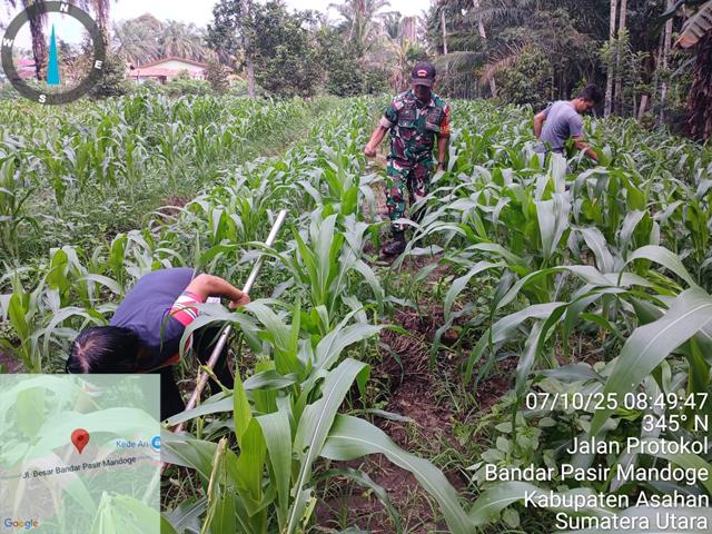 Wujud nyata kemanunggalan TNI dengan rakyat dalam meningkatkan ketahanan pangan wilayah, dalam kesempatan ini Personel Bintara Pembina Desa (Babinsa) Koramil 14/Bandar Pasir Mandoge jajaran Kodim 0208/Asahan Serka L Siringo ringo turun kewilayah desa binaan untuk melaksanakan kegiatan membantu petani jagung warga masyarakat sekaligus memberikan Motivasi kepada petani jagung sehingga dapat meningkatkan kesejahteraan para petani jagung, bersama masyarakat melaksanakan pendampingan ketahanan pangan (Hanpang) jenis tanaman jagung untuk membersihkan rumput agar tanaman tumbuh subur, kegiatan ini bertujuan untuk menjalin hubungan yang humanis antara Babinsa dengan warga binaannya sehingga TNI semakin di Cintai Rakyat, bersama dengan Bapak Rizki Lubis dan Ibu Rohana, kegiatan tersebut yang dilakukan bertempat di Dusun III Desa Bandar Pasir Mandoge Kecamatan Bandar Pasir Mandoge Kabupaten Asahan, Selasa (07/10/2025).