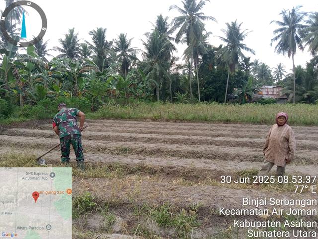 Kegiatan ini juga kita lakukan untuk memberikan dorongan semangat dan motivasi kepada para petani desa binaan agar lebih giat dalam bekerja sehingga mendapatkan hasil yang baik dan maksimal serta berharap dapat meningkatkan perekonomian dan kesejahteraan petani itu sendiri, dalam kesempatan ini seperti halnya yang dilakukan oleh Personel Bintara Pembina Desa (Babinsa) Koramil 07/Air Joman jajaran Kodim 0208/Asahan Serda Armain Solihin kegiatan Babinsa dalam hal ini membantu petani membersihkan gulma/rumput liar yang tumbuh disela-sela bayam, kegiatan tersebut bertujuan untuk menjalin silaturrahmi antara Babinsa dan masyarakat binaan serta Babinsa selalu memberikan motivasi agar terus semangat dalam merawat kebun sayur-sayuran yang ada pada saat ini sehingga diharapkan pada saat panen tiba akan mendapatkan hasil yang memuaskan, dengan mengunjungi petani Bayam di kebun ibu Boimah, kegiatan tersebut yang dilaksanakan yang bertempat di Lingkungan VI Kelurahan Binjai Serbangan Kecamatan Air Joman Kabupaten Asahan, Selasa (01/07/2025).