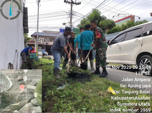 Asahan | Dalam rangka dan tujuan dilaksanaknnya kegiatan Gotong-royong pembersihan parit tiada lain untuk memperlancar aliran air agar tidak terjadi banjir pada saat hujan tiba, dalam kesempatan tersebut seperti hal yang dilakukan oleh Personel Bintara Pembina Desa (Babinsa) Koramil 08/Pulau Buaya jajaran Kodim 0208/Asahan Kopda Fadli Siagian turun kewilayah binaan untuk melaksanakan kegiatan gotong royong membersih kan parit dan badan jalan, Gotong-royong bersama masyarakat untuk membersihkan dan merapikan parit serta bahu jalan agar pada saat hujan tidak tersumbat oleh semak dan sampah-sampah sekaligus untuk menumbuhkan rasa peduli masyarakat terhadap kebersihan, Gotong royong bersama dengan masyarakat desa binaan untuk pembersihan parit yang tersumbat oleh sampah Babinsa juga menghimbau kepada masyarakat sekitar agar menjaga kebersihan dengan tidak membuang sampah ke parit agar saluran air berjalan lancar dan juga mencegah perkembangan jentik nyamuk agar masyarakat terhindar dari penyakit Demam berdarah, Babinsa juga menjalin silaturahmi dan semangat gotong royong, bersama dengan Bapak Jamal, Bapak Darwin dan Bapak Samsul, kegiatan tersebut yang dilaksanakan bertempat di Jalan Ampera Sei Apung Jaya Kecamatan Tanjung Balai Kabupaten Asahan, Minggu (30/11/2025).
