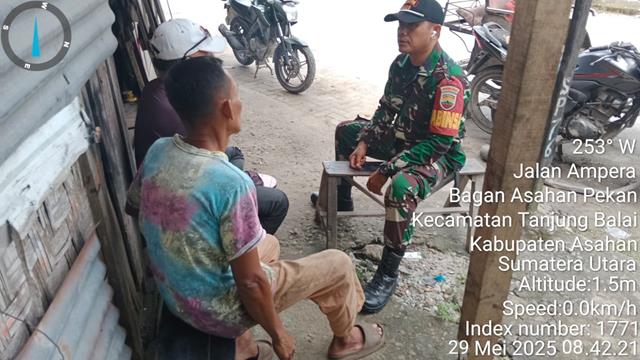 Dalam rangka agar terjalin kerjasama dan Tali Silahturami antar Babinsa dengan sesama Masyarakat serta dalam membangun sinergitas baik antara TNI khususnya Babinsa dengan masyarakat dan menjalin silahturahmi dengan masyarakat guna mendukung tugas Babinsa, seperti yang dilakukan Personel Bintara Pembina Desa Koramil 08/Pulau Buaya jajaran Kodim 0208/Asahan Serda M Harahap turun kewilayah binaan untuk melaksanakan kegiatan Komunikasi Sosial (Komsos) bersama dengan warga binaan dalam rangka agar terjalinnya hubungan yang harmonis dan Komunikasi yang baik Babinsa dengan masyarakat Desa binaan untuk mempererat tali silaturahmi, kegiatan Komsos dengan warga mengingatkan agar tetap menjaga kesehatan dan pekarangan masing-masing termasuk ganangan air agar di upayakan untuk di buang di karenakan cuaca akhir akhir ini yang tidak menentu, bersama dengan Bapak Safar dan Bapak Rusman, kegiatan tersebut yang dilaksanakan yang bertempat di Desa Bagan Asahan Induk Kecamatan Tanjung Balai Kabupaten Asahan, Jumat (30/05/2025).