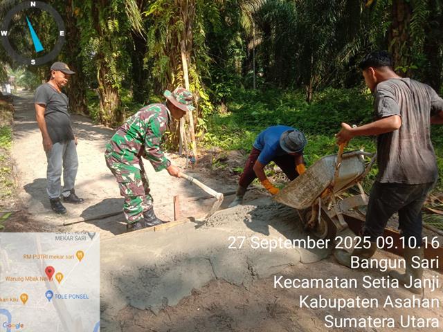 Asahan  |  Selalu hadir di tengah-tengah warga masyarakat binaan, dalam kesempatan ini seperti halnya yang dilakukan oleh Personel Bintara Pembina Desa (Babinsa) Koramil 13/Buntu Pane jajaran Kodim 0208/Asahan Serda Putra Kurnia turun kewilayah desa binaan untuk turut serta melaksanakan kegiatan Gotong Royong bersama Warga Mengecor Jalan diwilayah tersebut, kegiatan Komsos sekaligus membantu warga yang sedang mengecor jalan untuk akses jalan kewilayah tersebut, gotong royong bersama masyarakat memperbaiki jalan di dusun IV bangun sari agar akses warga menjadi lancar dan mudah dilalui, bersama dengan Bapak Badrul (Kadus IV), Bapak Herman (Warga) dan Bapak Nardi (Warga), kegiatan tersebut yang dilaksanakan bertempat di Dusun IV Desa Bangun Sari Kecamatan Setia Janji Kabupaten Asahan, Sabtu (29/09/2025).