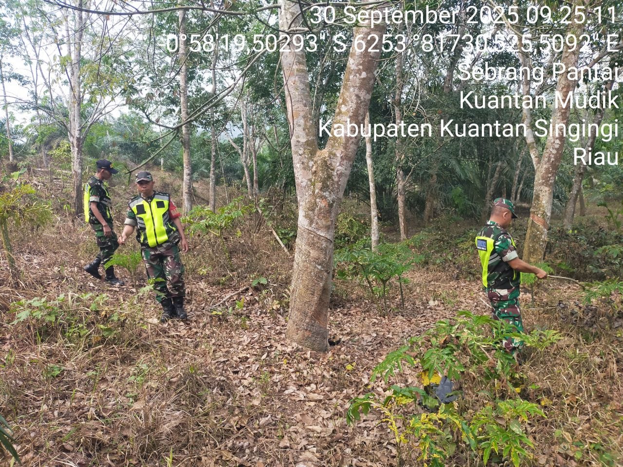 Babinsa Koramil 08/KM Kodim 0302/Inhu Serda Nopin bersama 3 orang anggota Lainnya melaksanakan kegiatan patroli pencegahan kebakaran hutan dan lahan (karhutla) Di Desa sebrang pantai kecamatan Kuantan mudik kabupaten Kuantan Singingi. Selasa ( 30/09/2025 ).