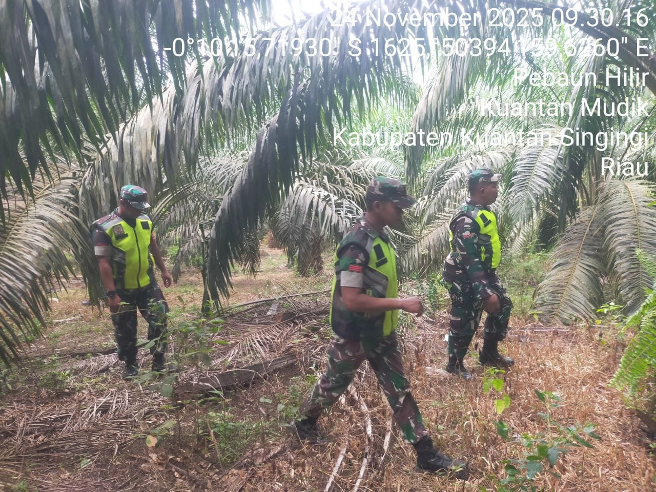 Babinsa Koramil 08/KM Kodim 0302/Inhu Serka Edi Syam bersama empat orang anggota Lainnya melaksanakan kegiatan patroli pencegahan kebakaran hutan dan lahan (karhutla) Di Desa Pebaun Hilir kecamatan Kuantan mudik kabupaten Kuantan Singingi. Senin ( 24/11/2025 ).