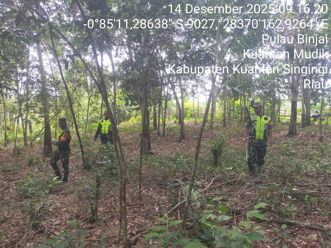 Babinsa Koramil 08/KM Kodim 0302/Inhu Sertu Nopin bersama 3 orang anggota Lainnya melaksanakan kegiatan patroli pencegahan kebakaran hutan dan lahan (karhutla) Di Desa Pulau Binjai kecamatan Kuantan mudik kabupaten Kuantan Singingi. Minggu ( 14/12/2025 ).