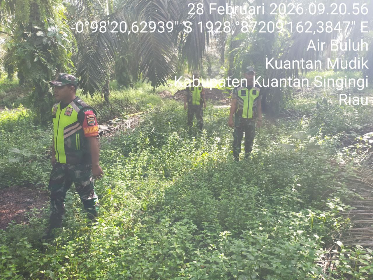 Babinsa Koramil 08/KM Kodim 0302/Inhu Sertu Hendro bersama rekan babinsa Lainnya melaksanakan kegiatan patroli pencegahan kebakaran hutan dan lahan (karhutla) Di Desa Air Buluh kecamatan Kuantan mudik kabupaten Kuantan Singingi. Sabtu ( 28/02/2026 ).