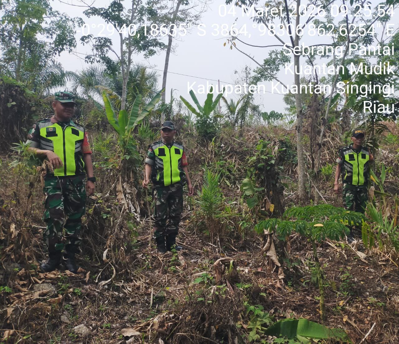 Babinsa Koramil 08/KM Kodim 0302/Inhu Sertu Kadarisman bersama rekan babinsa Lainnya melaksanakan kegiatan patroli pencegahan kebakaran hutan dan lahan (karhutla) Di Desa Sebrang Pantai kecamatan Kuantan mudik kabupaten Kuantan Singingi. Rabu ( 04/03/2026 ).