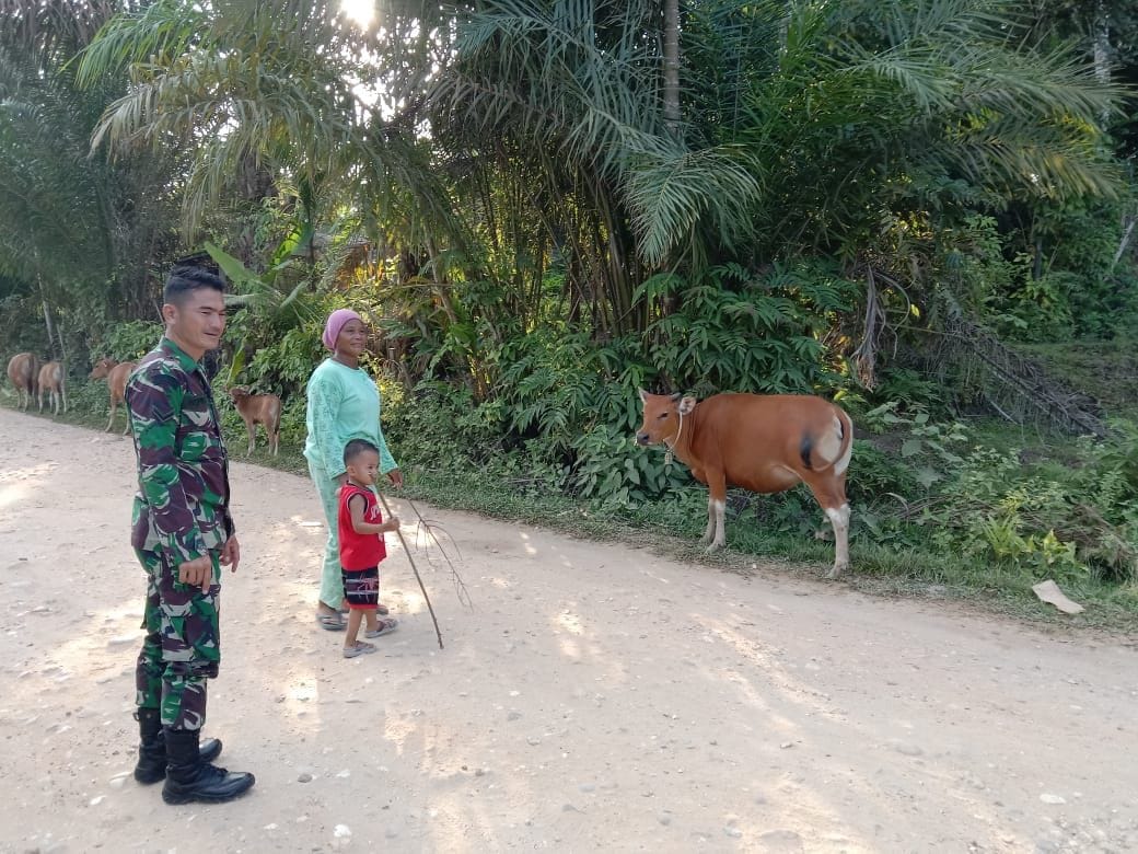 Babinsa di wilayah turun langsung memantau kesehatan ternak di sejumlah peternakan yang ada.Tujuannya untuk mencegah virus PMK dengan melihat langsung hewan peternak kemungkinan adanya ciri-ciri hewan tersebut terjangkit virus PMK.”Ia mengimbau kepada warga maupun peternak agar selalu menjaga kebersihan kandang dan kesehatan hewan ternaknya serta mengantisipasi datangnya hewan ternak seperti sapi, kambing dan kerbau dari wilayah lain”.Ujar Babinsa.
