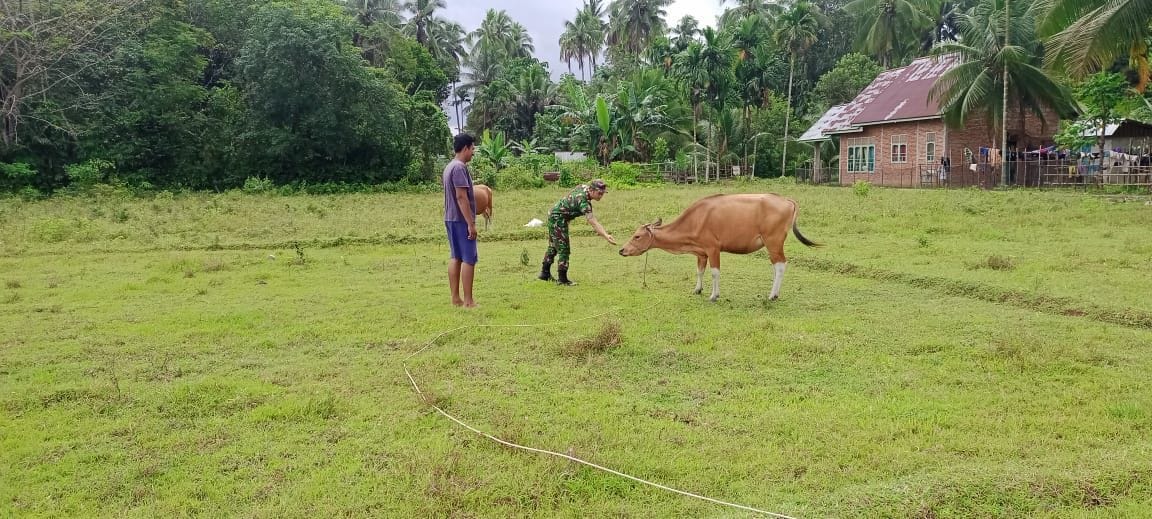 Anggota Koramil 08/KM Kodim 0302/Inhu Serda Ari Waluyo melaksanakan pemeriksaan terhadap ternak sapi milik warga di wilayah Desa binaan Demi mengantisipasi dan mencegah penularan Penyakit Mulut dan Kuku (PMK) bertempat Di Desa Muara Petai Kecamatan Pucuk Rantau Kabupaten Kuantan Singingi. Rabu ( 24/12/2025 ).