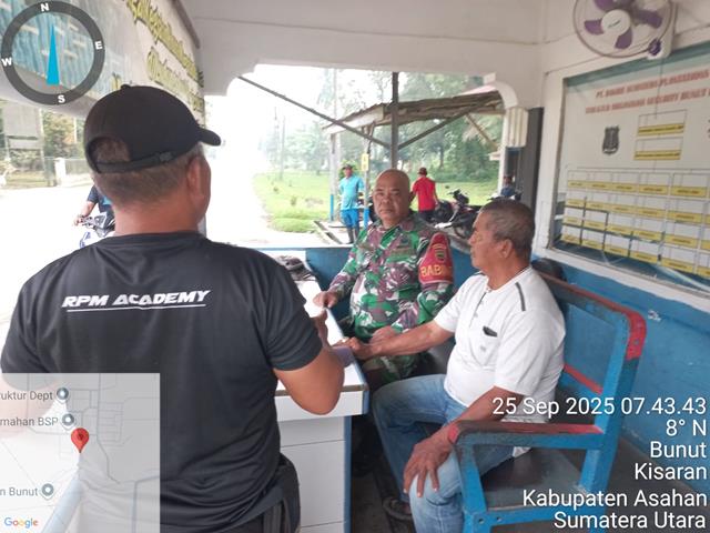 Asahan  |  Menurut kita keamanan merupakan hal yang tidak terlepas dari peran Security dan masyarakat baik disalah satu perusahaan dan ditempat umum, keamanan lingkungan diwilayah sebuah perusahaan tidak terlepas dari peran para security atau satpam dalam menjaga keamanan, baik diluar dan didalam lokasi perusahaan itu sendiri, dalam kesempatan ini seperti halnya yang dilakukan oleh Personel Bintara Pembina Desa (Babinsa) Koramil 06/Kisaran jajaran Kodim 0208/Asahan Sertu Lumalo Harahap turun kewilayah desa binaan untuk melaksanakan kegiatan Komunikasi Sosial (Komsos) bersama dengan Scurity dan warga Masyarakat binaan, kegiatan Komsos dengan Security Bunut Rubber Factory, bersama dengan Bapak Ikhsan dan Bapak Elly, kegiatan tersebut yang dilaksanakan bertempat di Kelurahan Bunut Kecamatan Kisaran Barat Kabupaten Asahan, Kamis (25/09/2025).