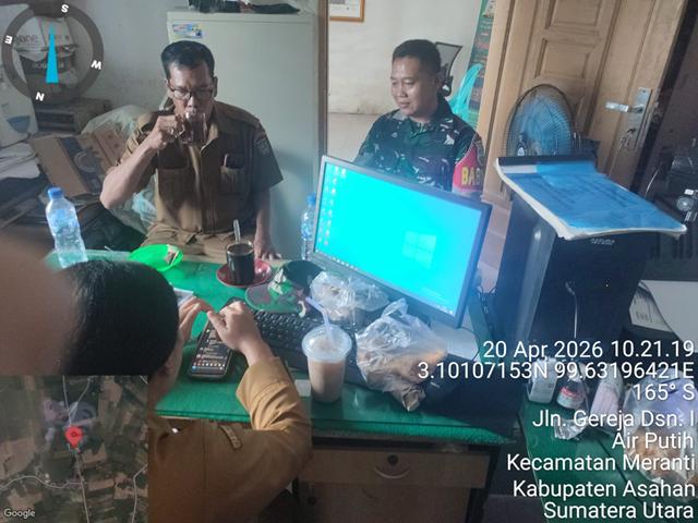Asahan | Dalam rangka untuk menciptakan dan meningkatkan kerja sama yang baik serta menjalin hubungan antara TNI dan aparatur desa serta untuk menciptakan kemanunggal TNI dengan Rakyat, dalam kesempatan tersebut seperti hal yang dilakukan oleh Personel Bintara Pembina Desa (Babinsa) Koramil 18/Meranti jajaran Kodim 0208/Asahan Kopda Rahmat Saleh turun kewilayah binaan untuk melaksanakan kegiatan Komunikasi Sosial (Komsos) bersama dengan perangkat Desa untuk menjalin silaturahim antara Babinsa dan aparat Desa dan untuk mengetahui permasalahan yang ada diwilayah desa binaan, Komsos dengan perangkat desa Binaan dan berkoordinasi membicarakan tentang tugas tugas program pemerintah pusat yang sudah dijalankan pemerintah desa dan mempererat hubungan pemerintah desa dan Babinsa sesuai dengan tugas tugas Komando atas, Komsos dengan aparat desa air putih dalam rangka menjalin kerjasama anatar babinsa dan aparatur desa binaan dan sebagai informasi pertahanan dan keamanan desa, Bersama dengan Bapak Hendri Sirait (Kadus 3), Ibu Marisa Panjaitan (Bendahara Desa) dan Ibu eni jayati (Kasi Operator).
