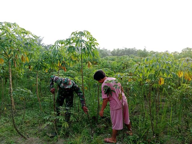 Dalam rangka untuk memelihara dan menjalin hubungan baik Antara Babinsa dan Petani, untuk meningkatkan rasa kepedulian terhadap masyarakat pada umumnya dan untuk menciptakan Kemanunggalan TNI dengan Rakyat, bersama masyarakat melaksanakan pendampingan ketahanan pangan (Hanpang) jenis tanaman Ubi kayu agar tetap terawat dan membersihkan tanaman supaya hasilnya lebih baik dan menguntungkan, kegiatan tersebut dilaksanakan untuk membantu Bapak Sumarno membersihkan gulma rumput yg tumbuh disekitaran tanaman ubi kayu miliknya, dengan harapan supaya dapat memperoleh hasil panen ubi yang memuaskan, selain itu juga Babinsa bertukar pikiran dengan Bapak Sumarno bagaimna cara menanam dan merawat ubi yang baik sekaligus melaksanakan silaturahmi dengan para petani di desa binaan, kegiatan ini bertujuan untuk saling membantu antara Babinsa dengan wargabinaannya sehingga tercipta hubungan dan kerjasama yang baik sehingga TNI semakin di Cintai Rakyat.