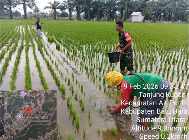 Dalam rangka untuk memelihara dan menjalin hubungan baik dengan masyarakat, untuk meningkatkan Sinergitas dan kemanunggalan antara TNI dengan masyarakat, dalam kesempatan ini seperti yang dilakukan oleh Personel Bintara Pembina Desa (Babinsa) Koramil 02/Air Putih jajaran Kodim 0208/Asahan Praka Deni Masrial turun kewilayah binaan untuk melaksanakan kegiatan ketahanan pangan, dengan melaksanakan pendampingan Han Pangan dilahan Sawah dengan membantu petani dalam Pemupukan, kegiatan Hanpangan membantu Petani memupuk tanaman Padi agar tanaman Padi menghasilkan Gabah yang berkualitas dan tahan terhadap Hama dilahan sawah milik Bapak Sugiman seluas 6 rante, bersama dengan Bapak Sugiman (pemilik Lahan) dan Bapak Hengki Damanik (Petani), kegiatan tersebut yang dilaksanakan bertempat di Desa Tanjung Kubah Kecamatan Air Putih Kabupaten Batu Bara, Senin (09/02/2026).