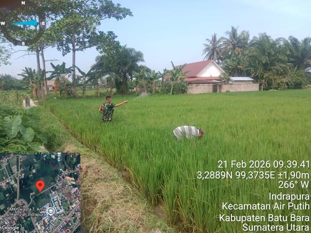 Dalam kesempatan ini seperti yang dilakukan oleh Personel Bintara Pembina Desa (Babinsa) Koramil 02/Air Putih jajaran Kodim 0208/Asahan Kopda S Wijatnarko turun kewilayah binaan untuk melaksanakan kegiatan ketahanan pangan, kegiatan pendampingan hanpang membantu petani memupuk tanaman padi, kegiatan pendampingan petani dalam program Hanpangan, kegiatan Hanpangan membantu Petani memupuk tanaman Padi agar tanaman Padi menghasilkan Gabah yang berkualitas dan tahan terhadap Hama di lahan sawah milik Bapak Mukidi seluas 3 rante, kegiatan tersebut yang dilaksanakan bertempat di Indrapura Kecamatan Air Putih Kabupaten Batu Bara, Sabtu (21/02/2026).