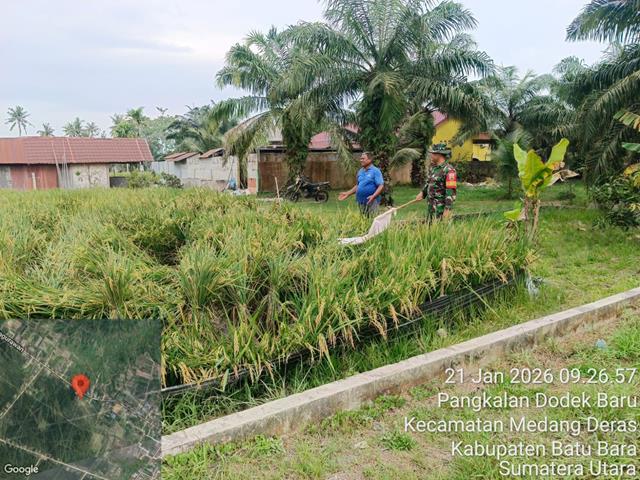 Dalam kesempatan ini seperti hal yang dilakukan oleh Personel Bintara Pembina Desa (Babinsa) Koramil 01/Medang Deras jajaran Kodim 0208/Asahan Serma Edi Kurniawan turun kewilayah binaan untuk melaksanakan kegiatan membantu Petani menjaga hama burung dan memasang orang orang di sawah dalam rangka Hanpangan, dengan melaksanakan Kegiatan pendampingan petani membantu dalam mengusir hama padi (burung) dilahan Bapak Sulaiman Seluas 10 Rante dalam merawat tanaman padi sehingga mendapatkan hasil panen yang maksimal guna mendukung program pemerintah Tercapainya Swasembada pangan, bersama dengan Bapak Sulaiman, kegiatan tersebut yang dilaksanakan bertempat di Kelurahan Pangkalan Dodek Baru Kecamatan Medang Deras Kabupaten Batu Bara, Rabu (21/01/2026).
