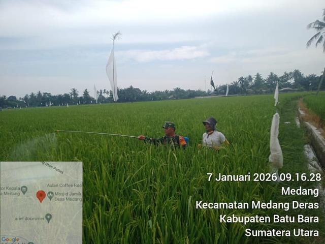 Dalam kesempatan ini seperti yang dilakukan oleh Personel Bintara Pembina Desa (Babinsa) Koramil 01/Medang Deras jajaran Kodim 0208/Asahan Sertu Lutan Harahap turun kewilayah binaan untuk turut serta melaksanakan pendampingan Hanpangan jenis tanaman padi, kegiatan Hanpangan membantu menyemprot hama jenis ulat guna untuk pertumbuhan padi agar tumbuh lebih baik, kegiatan Hanpangan membantu Petani menyemprot hama ulat daun padi, kegiatan pendampingan Hanpangan dilahan Bapak Sopyan Seluas 10 Rante membantu petani dalam penyemprotan hama yang dapat merusak pertumbuhan padi, agar hasil padi sesuai yang di harapkan dan mendapatkan hasil yang melimpah dan bertujuan mendukung program pemerintah agar Tercapainya Swasembada pangan dengan Hasil yang memuaskan, bersama dengan Bapak Sopyan, kegiatan tersebut yang dilaksanakan bertempat di Desa Medang Kecamatan Medang Deras Kabupaten Batu Bara, Rabu (07/01/2026).