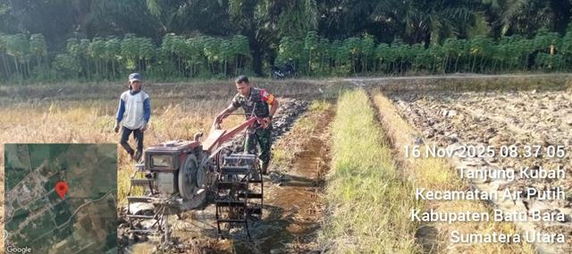 Untuk mensukseskan Swasembada Pangan yang ada diwilayah desa binaan, pada kesempatan ini seperti yang dilakukan oleh Personel Bintara Pembina Desa (Babinsa) Koramil 02/Air Putih jajaran Kodim 0208/Asahan Kopda Erwinsyah turun kewilayah binaan untuk melaksanakan kegiatan pendampingan Han Pangan, dengan melaksanakan kegiatan Hanpangan dengan Petani di sawah, kegiatan Ketahanan Pangan membantu petani Membajak Sawah, kegiatan dilaksanakan di sawah milik Bapak Juanda Seluas 7 Rante, maksud tujuan dilakukan kegiatan tersebut untuk membantu petani dalam proses membajak sawah menggunakan mesin traktor untuk mendapatkan hasil tanah lebih gembur, Bibit tanaman dapat tumbuh subur, Tanah menjadi lebih berkualitas dan layak untuk ditanami padi, bersama dengan Bapak Juanda (Pemilik Sawah), kegiatan tersebut yang dilaksanakan bertempat di Desa Tanjung Kubah Kecamatan Air Putih Kabupaten Batu Bara, Minggu (16/11/2025).