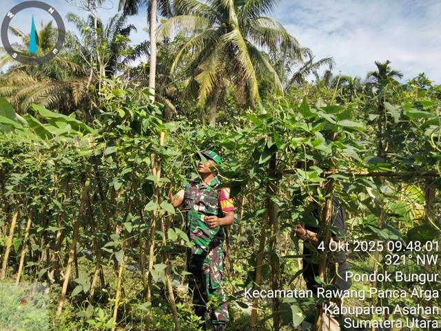 Dalam kesempatan ini seperti yang dilakukan oleh Personel Bintara Pembina Desa (Babinsa) Koramil 18/Meranti jajaran Kodim 0208/Asahan Serda Eko Hardika turun kewilayah binaan untuk melaksanakan kegiatan Pendampingan Han Pangan dalam perawatan tanaman kacang panjang bersama warga Binaan, kegiatan ini bertujuan untuk menjalin Tali Silaturahmi antara Babinsa dan warga binaan pemilik kebun, kegiatan membantu warga Memanen sayuran Kacang Panjang, kegiatan tersebut bertujuan untuk menciptakan hubungan yang humanis antara babinsa dengan warga binaan, Babinsa senantiasa menghimbau dan memberikan Motipasi kepada seluruh warga untuk dapat memanfaatkan lahan semaksimal mungkin dengan membudi daya tanaman pangan agar tetap tersedianya kebutuhan pangan dan menambah penghasilan, bersama dengan Bapak Wahit (pemilik kebun), kegiatan tersebut yang dilaksanakan bertempat di Desa Pondok Bungur Kecamatan Rawang Panca Arga Kabupaten Asahan, Sabtu (04/10/2025).