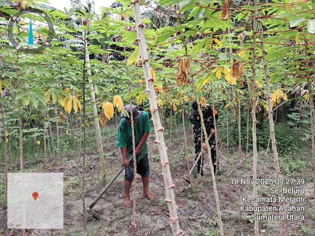 Dalam rangka untuk memelihara dan menjalin hubungan baik Antara Babinsa dan petani, untuk meningkatkan rasa kebersamaan untuk menyukseskan program swasembada pangan dan untuk menjaga Kemanunggalan TNI dengan Rakyat, untuk meningkatkan taraf perekonomian masyarakat dengan memanfaatkan keberadaan lahan tidur, setiap orang tentu sudah tak asing lagi dengan makanan ubi kayu, tetapi ubi kayu tersebut lebih terkenal dengan nama singkong, dalam kesempatan ini seperti yang dilakukan oleh Personel Bintara Pembina Desa (Babinsa) Koramil 18/Meranti jajaran Kodim 0208/Asahan Serka Jevi Rahman Siahaan turun kewilayah binaan untuk melaksanakan kegiatan Wanwil/Hanpangan kebun singkong, kegiatan Hanpangan membantu petani menanam Ubi dan merawat ubi milik Bapak Wagino, kegiatan tersebut yang dilaksanakan bertempat di Dusun VI Desa Sei Beluru Kecamatan Meranti Kabupaten Asahan, Selasa (18/11/2025).