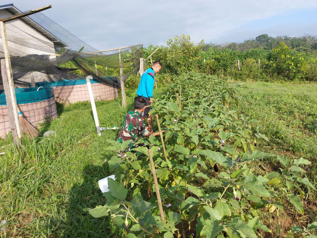 Teluk Kuantan – Pratu Rikky S. Saragih selaku Babinsa Koramil 02/Kuantan Tengah Kodim 0302/Inhu melakukan kegiatan komunikasi sosial (Komsos) bersama petani terong bapak Idep yang berada di wilayah binaannya tepatnya yang berada di desa Kalimanting Kec. Benai Kab. Kuansing, Jum’at (29/08/2025).